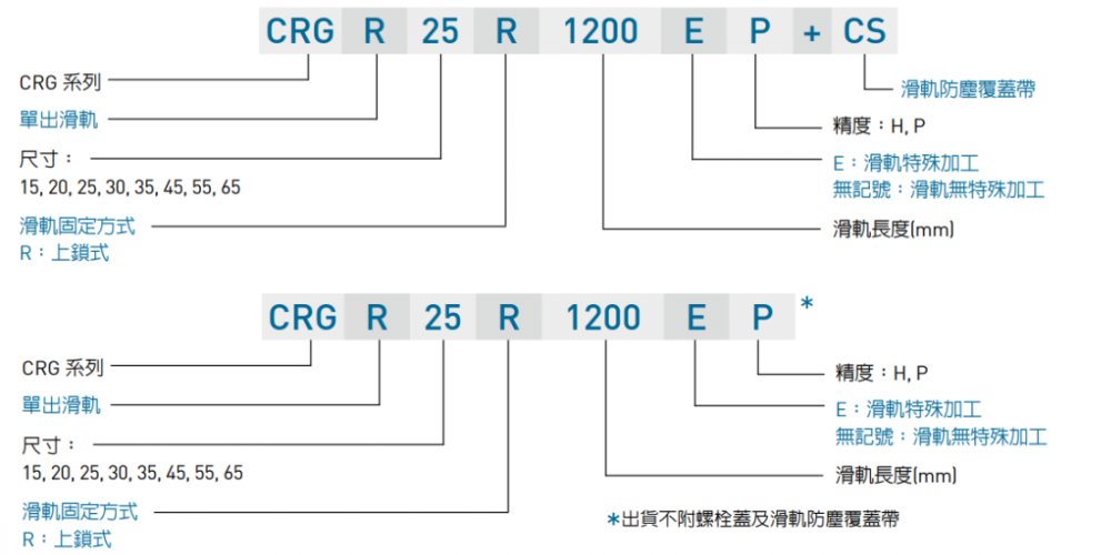 产品规格说明 CRG系列分为非互换性及互换性型两种直线导轨,两者规格尺寸相同,主要差异点在于互换性型之滑块、导轨可单独互换使用,较便利,但其组合精度无法达到非互换性型之超精密级以上的精度,不过由于HIWIN互换性型之组合精度目前已达到一定的水准,对不需配对安装直线导轨的客户而言,是一项便利的选择。直线导轨的产品规格型号主要标明直线导轨尺寸、型式、精度等级、预压等规格要求,以利订货时双方对产品的确认。