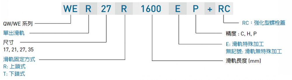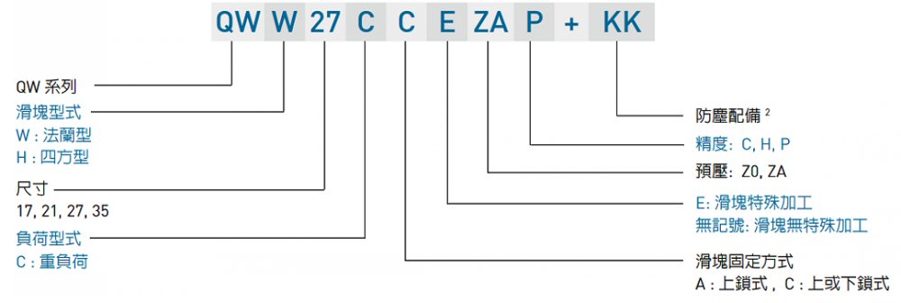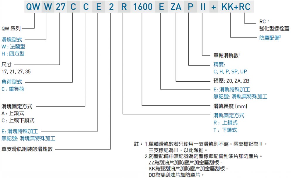 产品规格说明 QW系列分为非互换性及互换性型两种直线导轨,两者规格尺寸相同,主要差异点在于互换性型之滑块、滑轨可单独互换使用,较便利,但其组合精度无法达到非互换性型之超精密级以上的精度,不过由于HIWIN互换性型之组合精度目前已达到一定的水平,对不需配对安装直线导轨的客户而言,是一项便利的选择。直线导轨的产品规格型号主要标明直线导轨尺寸、型式、精度等级、预压等规格要求,以利订货时双方对产品的确认。QW系列与WE系列滑轨共享,客户无需为了选用静音式产品而重新设计安装尺寸,如此更加提升了QW系列的应用性与可互换性。